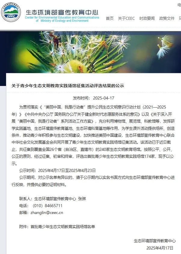 近日,由生態(tài)環(huán)境部宣傳教育中心聯(lián)合中華社會(huì)文化發(fā)展基金會(huì)共同開展了青少年生態(tài)文明教育實(shí)踐場(chǎng)館征集活動(dòng),廣州市環(huán)境保護(hù)技術(shù)有限公司在全國26個(gè)?。ㄗ灾螀^(qū)、直轄市)的240家生態(tài)文明教育場(chǎng)館中脫穎而出,被評(píng)選為“首批青少年生態(tài)文明教育實(shí)踐場(chǎng)館”。
