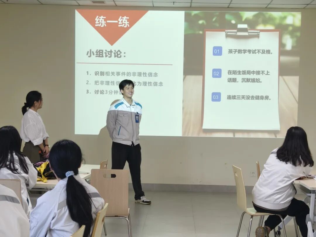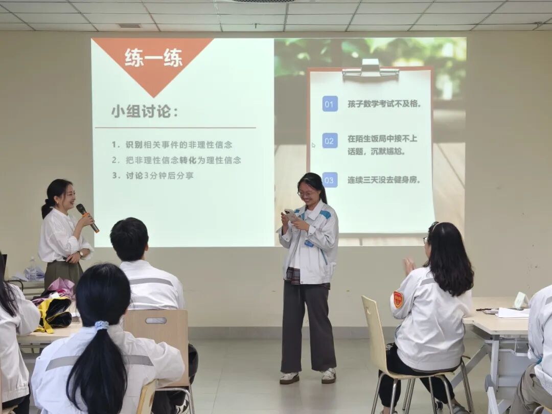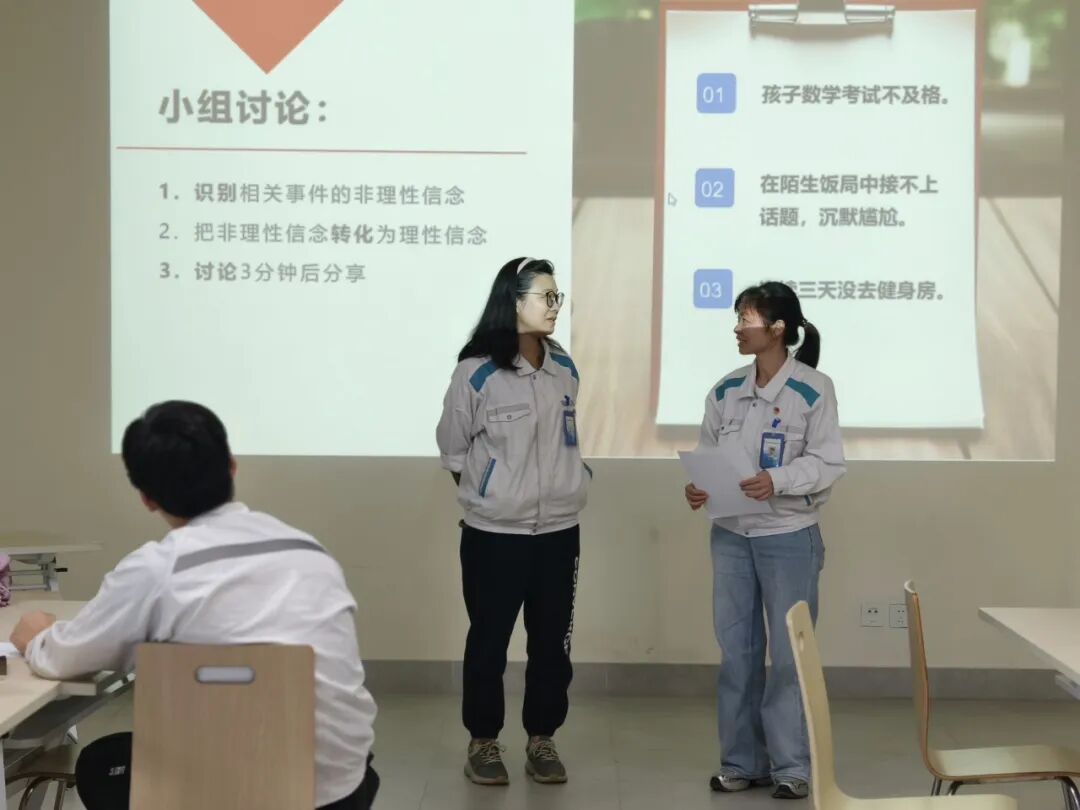 在認(rèn)知調(diào)節(jié)教學(xué)中,張老師引入“情緒ABC理論”,引導(dǎo)學(xué)員認(rèn)識到:影響我們情緒和行為的并非事件本身,而是我們對事件的看法。學(xué)員們分組圍繞“非理性信念”展開討論,練習(xí)如何將其轉(zhuǎn)化為理性信念,提升應(yīng)對壓力的能力。